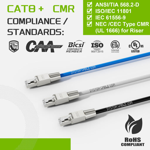 CAT 8 Ethernet RJ45 Patch Cable, 2000MHz, 22/4pr Solid CU, CMR, Indoor/Outdoor