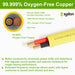 99.999% oxygen-free copper, which has better conductivity, and more importantly, minimizes phase shifts and distortions that degrade sound quality, reduces resistance, is less likely to corrode so lasts longer, doesn’t heat up as much as other conductors, and is less likely to ‘short’.