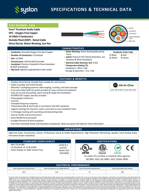 14/4 Speaker Wire Audio Cable In-Wall Outdoor Direct Burial OFC Sun Res
